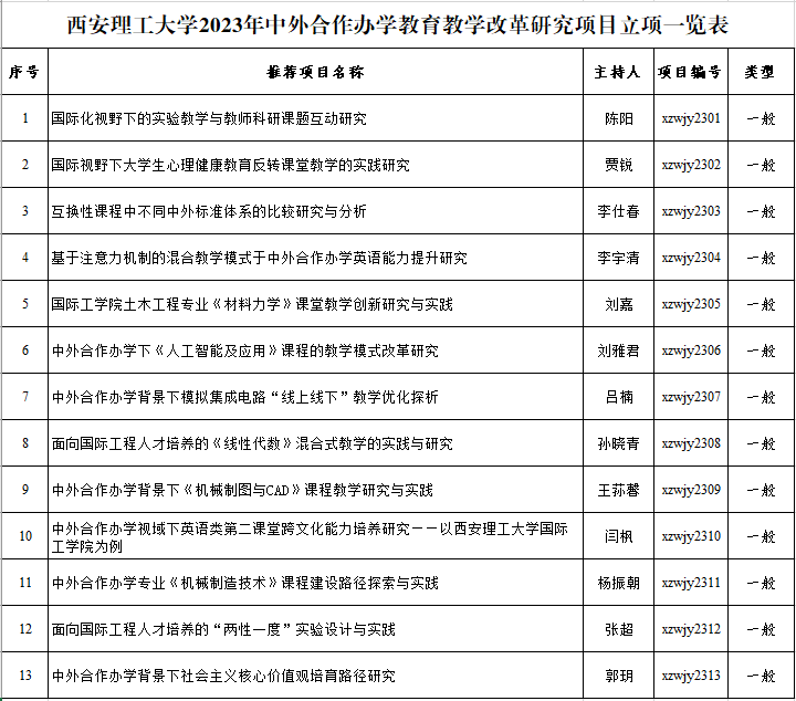 2023年立项的中外合作办学教学研究项目(具体名单见下表)