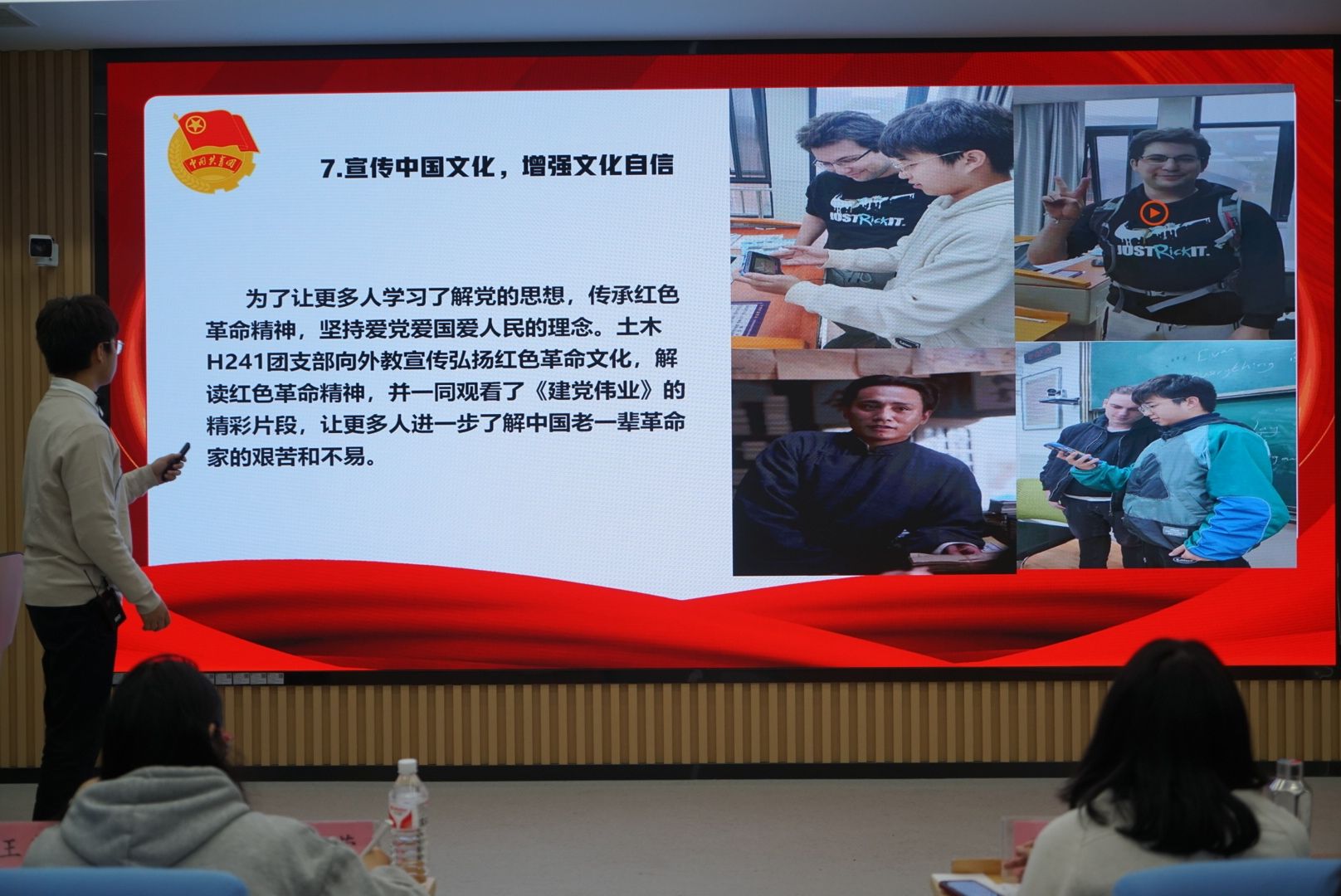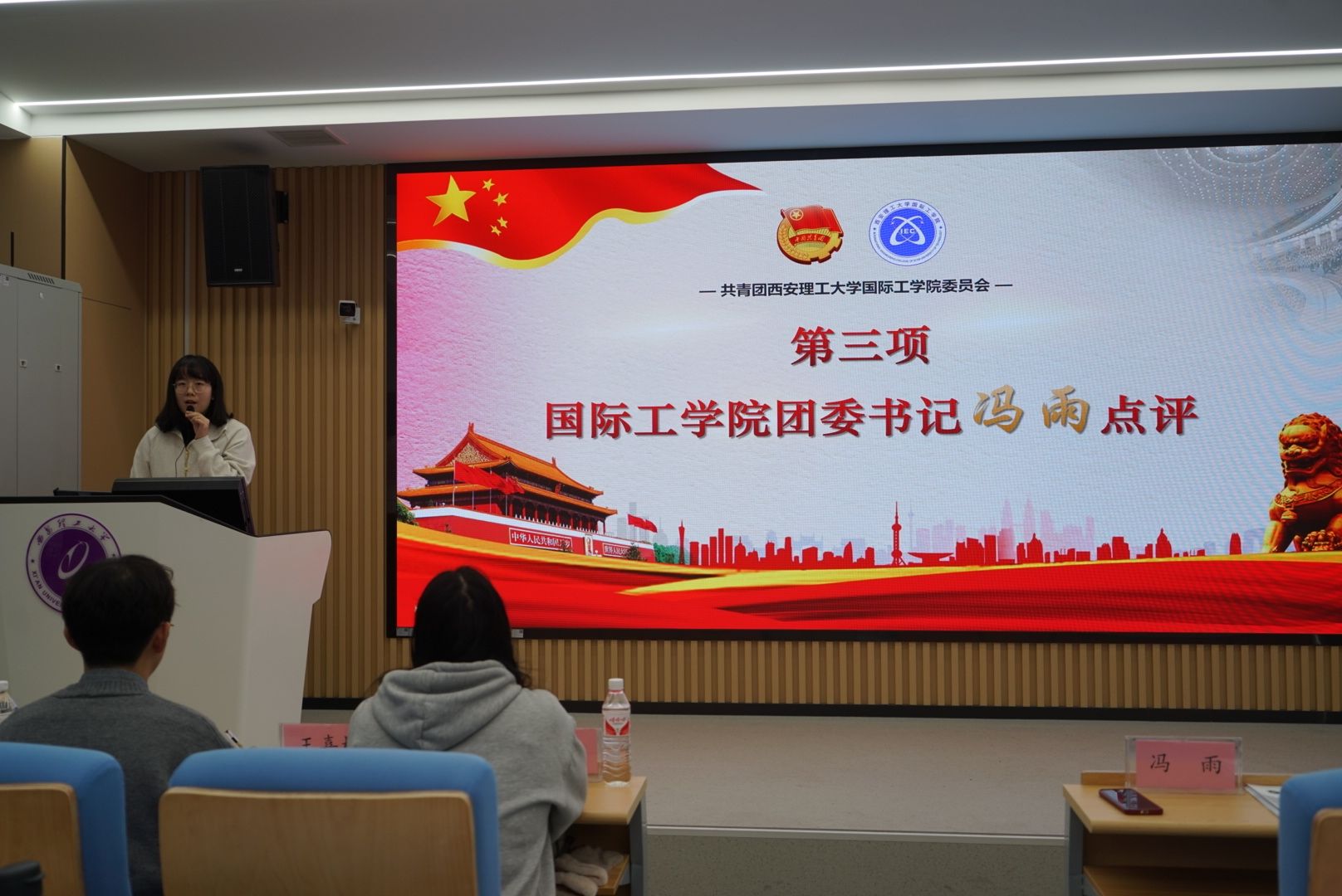 团委书记冯雨老师对八位团支书的汇报进行了细致点评,肯定了各团支部在用心、用情准备团日活动,组织有序、分工合理,团支部的活动设计新颖,巧妙与外国友人进行互动,并让团日活动走出校园、走向校外。同时希望同学们怀抱梦想又脚踏实地,敢想敢为又善作善成,在奋斗中释放青春激情、追逐青春理想!